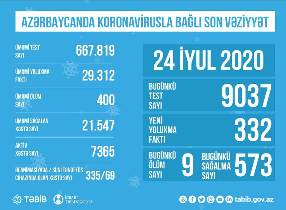 Tibbi Ərazi Bölmələrini İdarəetmə Birliyi (TƏBİB) Azərbaycanda koronavirusla bağlı iyulun 24-nə olan statistik göstəriciləri açıqlayıb.