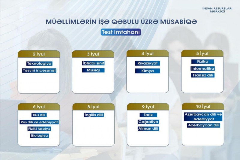 Qeyd edilib ki, müəllimlərin işə qəbulu üzrə müsabiqənin test imtahanları 2-10 iyul tarixlərində ölkənin 18 şəhəri olmaqla 39 imtahan mərkəzində təşkil olunacaq.