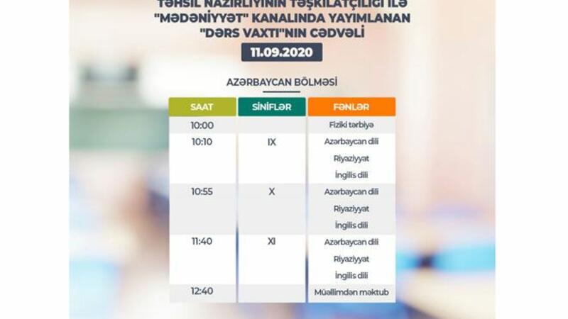 “Mədəniyyət” telekanalı və “Təhsil” televiziyasının “Facebook” səhifəsində yayımlanan “Dərs vaxtı” proqramının sentyabrın 11-i üçün nəzərdə tutulan cədvəli açıqlanıb.